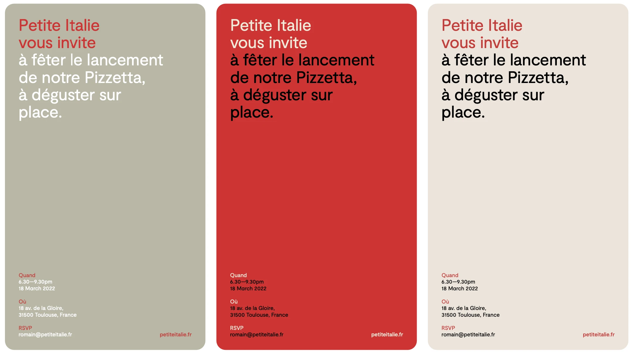 Cette identité gourmande permet au restaurant de créer une expérience immersive qui commence dès la découverte de la marque. L'univers visuel conçu renforce l'attractivité de la pizzeria auprès des amateurs de cuisine italienne authentique et facilite la fidélisation de la clientèle locale. La stratégie de branding positionne Petite Italie comme une parenthèse italienne authentique dans le paysage gastronomique toulousain.